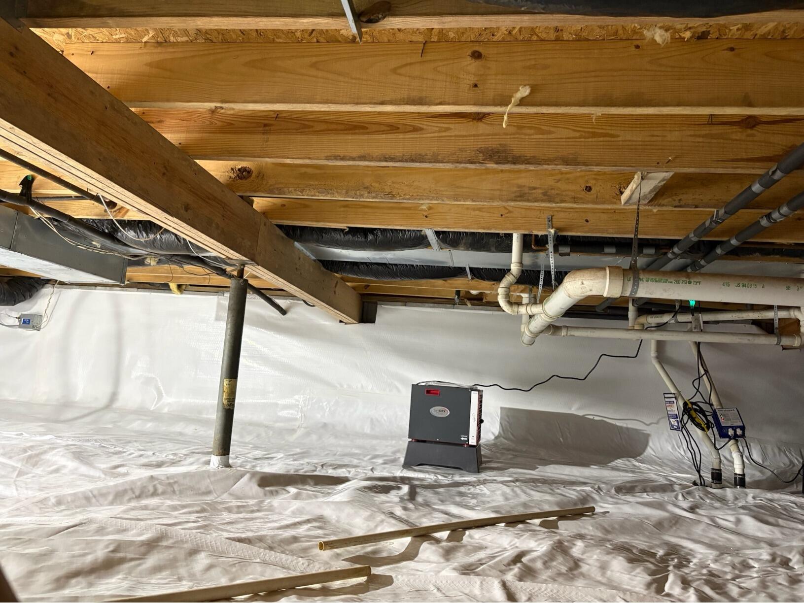 This vented crawl space was allowing wet air to enter in the Spring and Summer, and it was allowing for cold air to enter in the Winter and Fall. The wet air had destroyed the fiberglass insulation, damaged the wood, and caused musty smells. The cold air caused cold floors and higher energy bills in the winter. By encapsulating the crawl space with our CleanSpace moisture barrier, our SmartSump sump pump, and our SaniDry Sedona dehumidifier, we were able to completely change the look, feel, and smell of the crawl space.