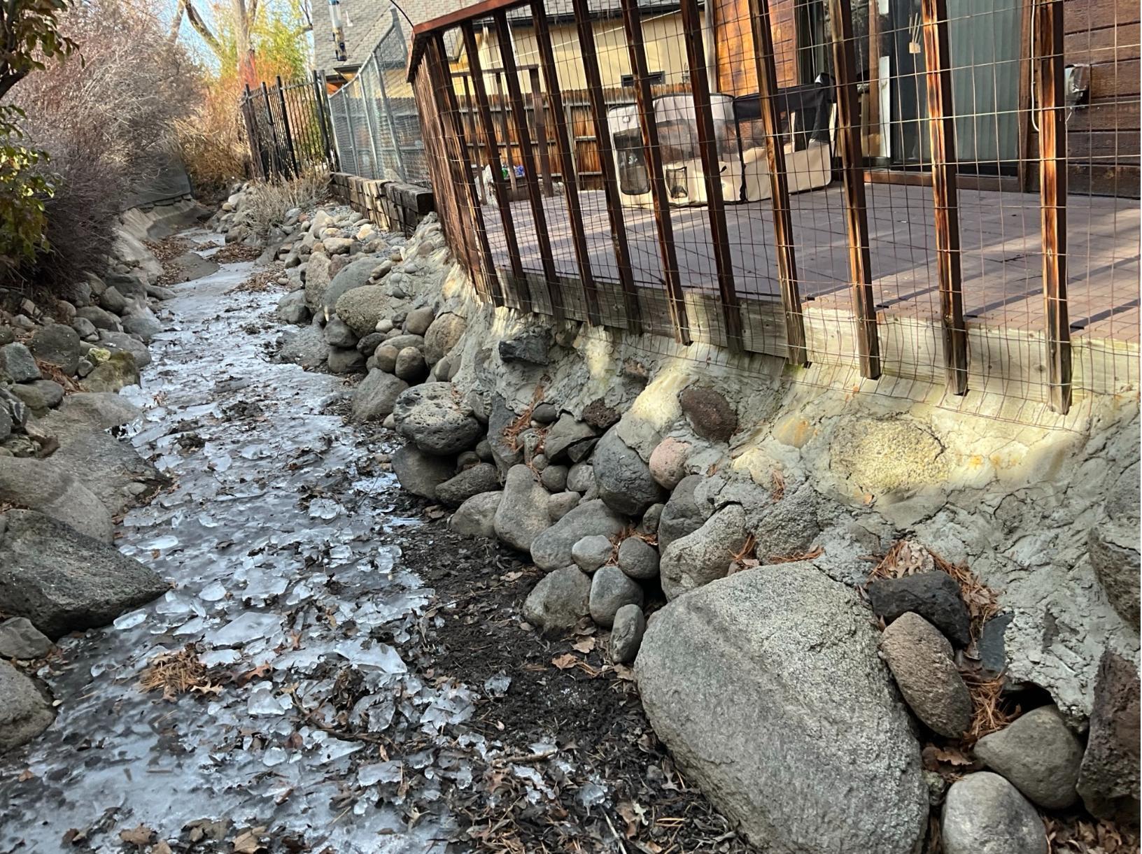 This property in Reno was experiencing ongoing water intrusion into the crawlspace due to seepage from an adjacent concrete-lined drainage ditch. The original bank consisted of loose boulders and deteriorating soil, allowing water to migrate through voids and compromise the structure below.