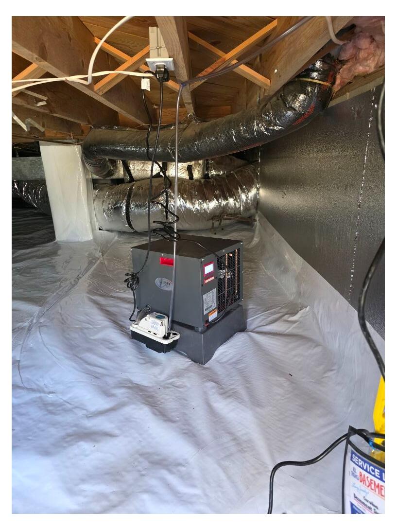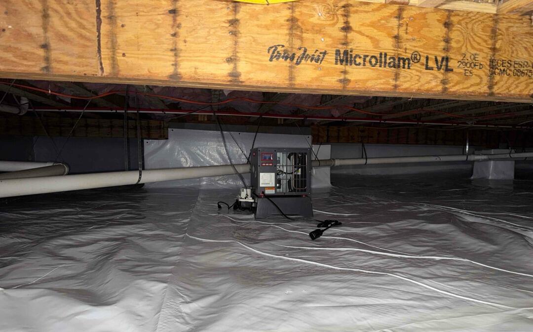 Our team installed a full crawlspace encapsulation system paired with a powerful SaniDry Sedona dehumidifier. The durable vapor barrier seals out ground moisture, while the SaniDry Sedona actively removes excess humidity from the air to maintain a dry, healthy environment year-round.