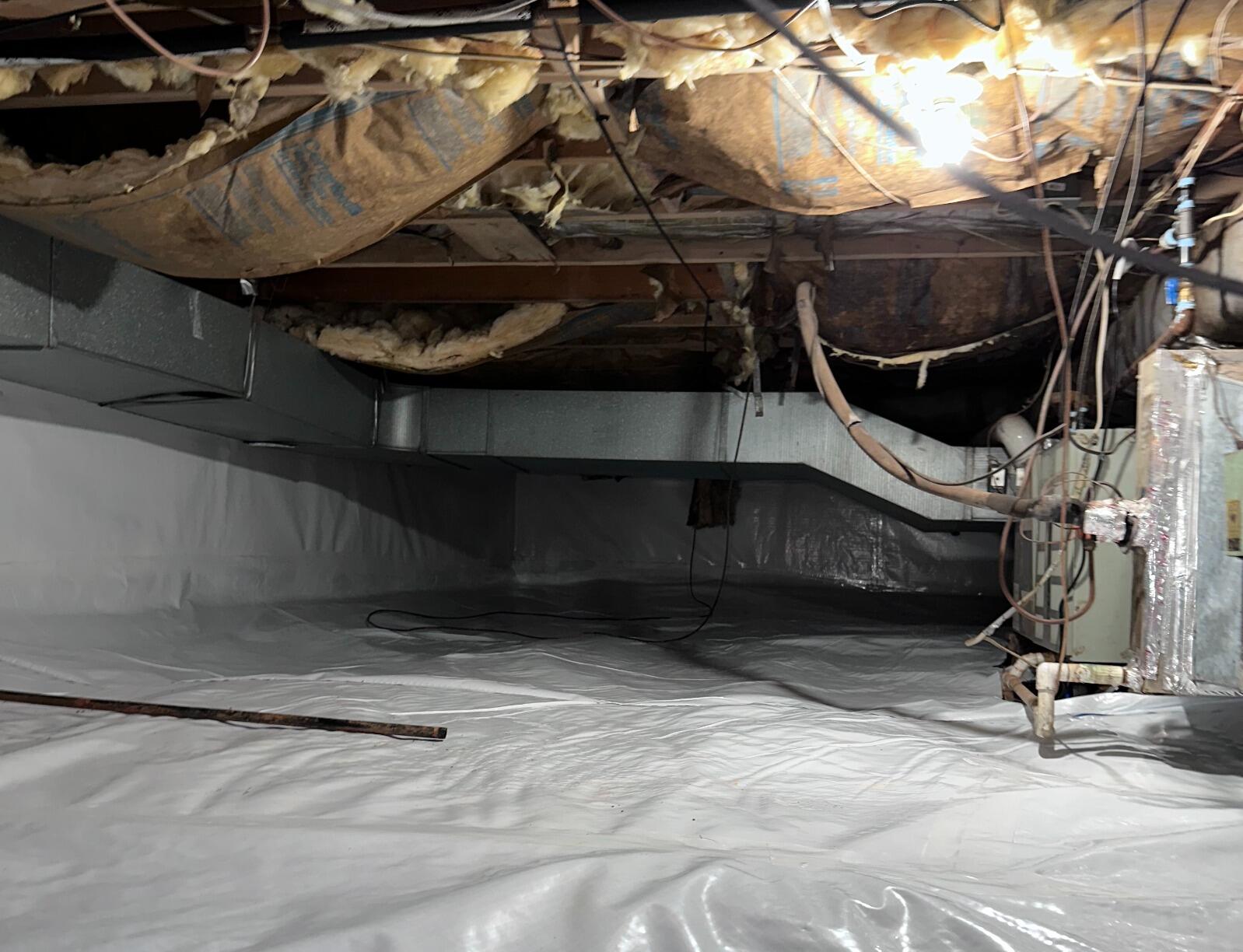 This formerly damp and humid crawl space got a brand new look and feel with our CleanSpace encapsulation system. Made from an ultra-durable polyethylene composition, our CleanSpace vapor barrier seals and protects against moisture and humidity - providing a brighter, drier, and healthier crawl space environment throughout.