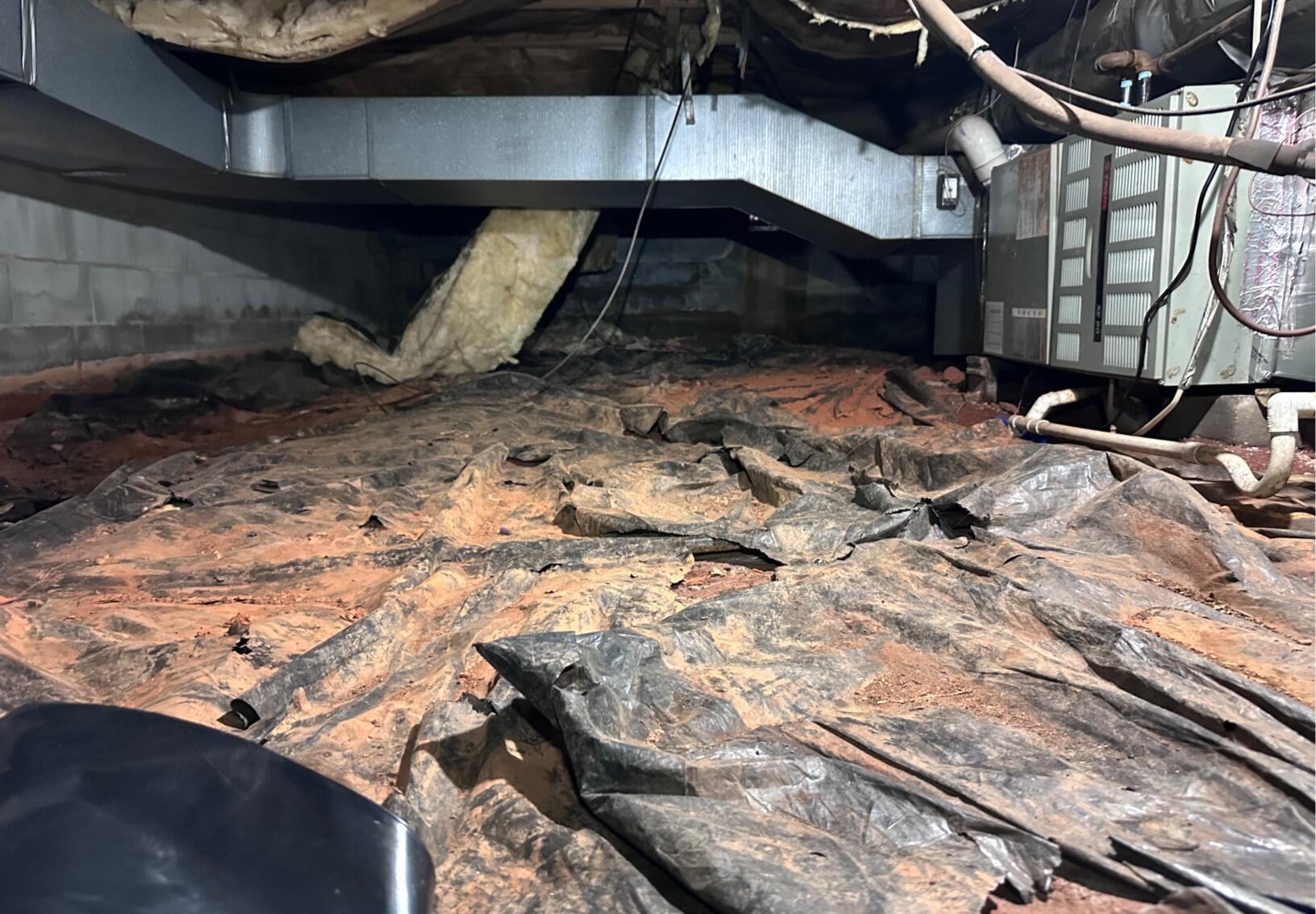This Winston-Salem, NC home underwent a complete crawl space transformation. The original crawl space had a damaged, ineffective vapor barrier with exposed soil, debris, and sagging insulation leaving the home vulnerable to moisture, odors, and poor air quality.