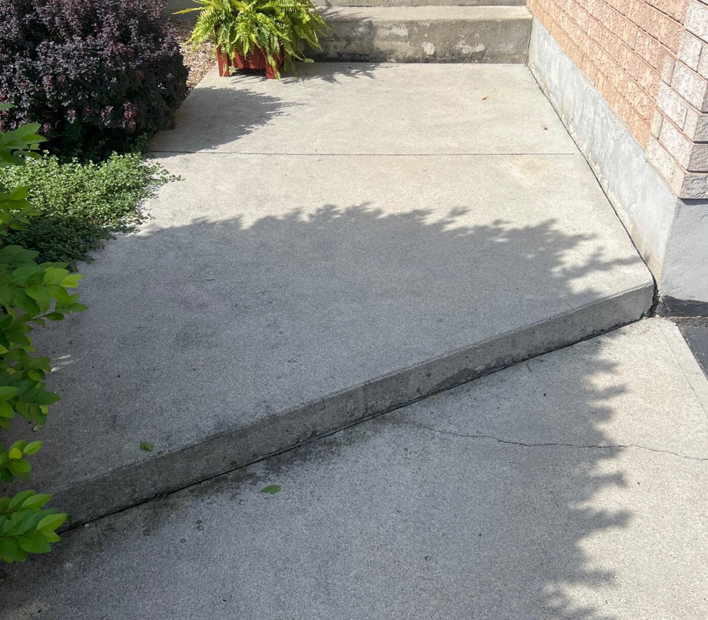 This concrete walkway had settled significantly, creating a 2-inch trip hazard at the transition point and sloping inward so that rain and snowmelt pooled on the surface, making the entrance slippery and accelerating joint deterioration. Canadian Concrete Leveling used our high-density polyurethane injection system to precision-lift the sunken sections, stabilizing the subgrade and restoring a flush, level surface. The result was a safe, smooth walkway that not only eliminated trip hazards but also restored the entrance’s original appearance. To ensure long-lasting protection, we applied our Premium Crack and Joint Sealant, creating a flexible, waterproof barrier that safeguards against future water damage. This approach provides a fast, durable, and cost-effective alternative to full concrete replacement for sunken or uneven walkways, giving homeowners peace of mind and a safe, attractive entrance.