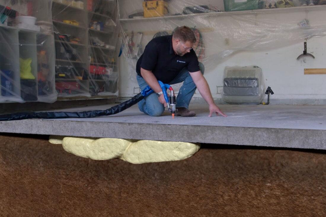 PolyLevel was engineered to permanently raise and level sinking concrete slabs. As seen here, the polyurethane foam fills voids underneath the concrete to help it become level again.